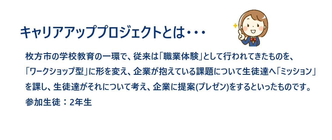 弊社ではこの度、2月5日(木)・6日(金)の2日間、枚方市立第一中学校で行われた『キャリアアッププロジェクト』に4年連続で地元企業として参加させていただきました。
