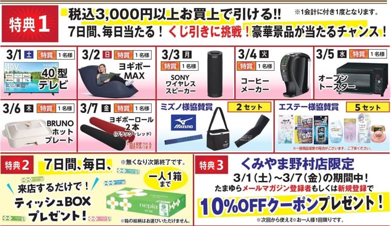 店内商品3000円(税込)以上お買い上げの当日レシートで豪華景品が当たるクジ引きにご参加いただけたり、ご来店いただくだけでプレゼントがもらえたり(※無くなり次第終了)・・・盛りだくさんの内容となっています!!!
