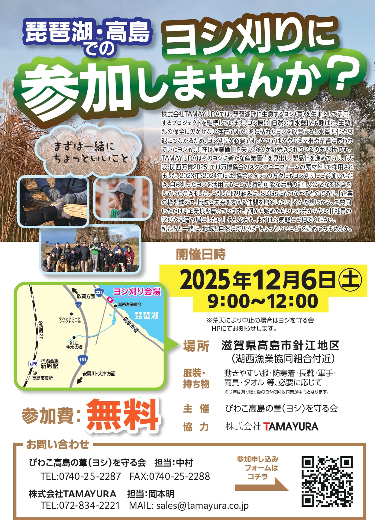 株式会社TAMAYURAでは、琵琶湖畔に生息するヨシ(葦)を生地として活用するプロジェクトを継続しています。 ヨシ原は「自然の浄水器」とも呼ばれ、生態系の保全に欠かせない存在ですが、冬に枯れたヨシを放置すると水質悪化につながるため、ヨシ刈りが必要です。かつてはかやぶき屋根などに使われていたヨシも、現在は産業価値を失い、多くが野焼きされています。 TAMAYURAはそのヨシに新たな産業価値を見出し、製品化を進めており、「大阪・関西万博2025」ではスタッフユニフォームの素材としても採用されました。2023年・2024年には、協会スタッフの皆様にもヨシ刈りにご参加いただき、持続可能な活動の“主人公”となる体験をしていただきました。