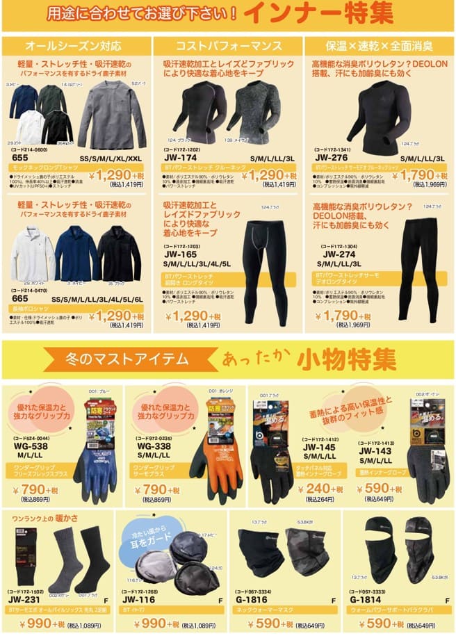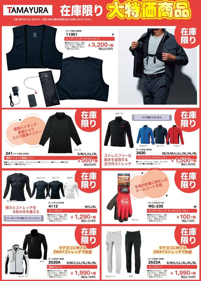 【法人営業部:商品情報】防寒特集/在庫限り大特価/インナーあったか小物特集