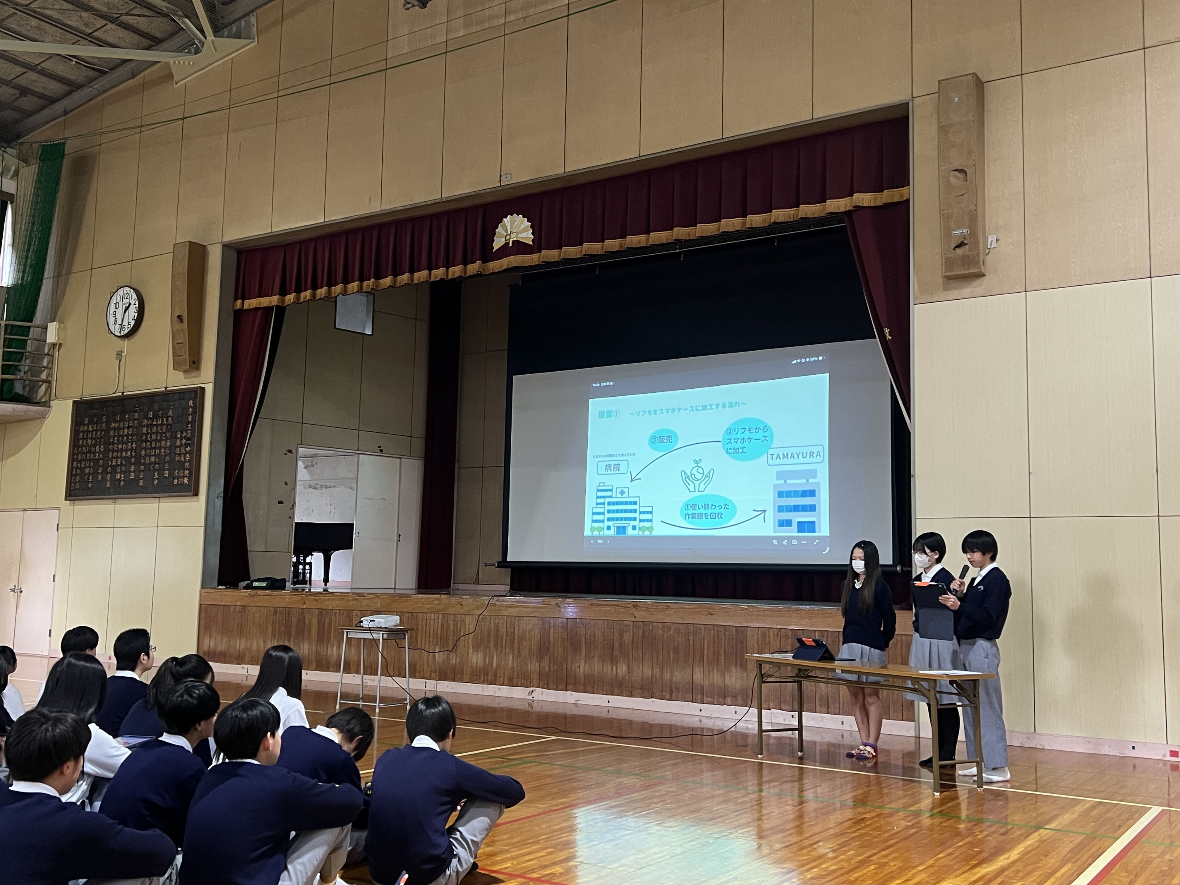 提示したミッションは大人でも頭を抱えるような難題で、生徒の皆さんは悩みながらも真剣に取り組み、企画検討~プレゼン用のスライド作成、発表までしっかりとやり遂げてくださいました。そしてiPadを駆使してのスライド作成は、そのレベルの高さに驚きの連続でした。また体育館での発表(プレゼン)も、どの班も堂々としていてとても素晴らしいものでした。