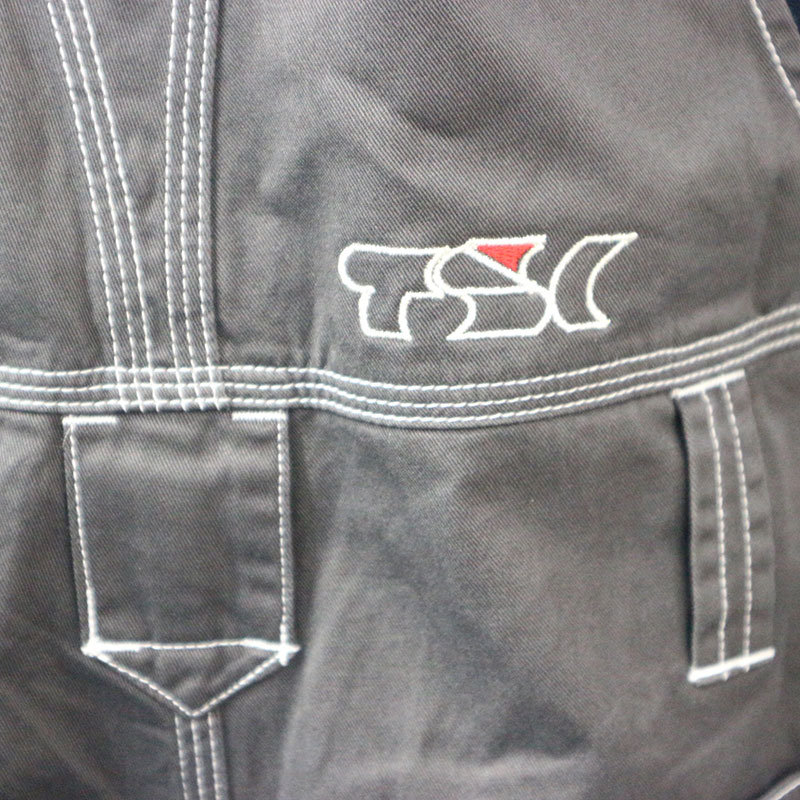 サロペット:刺繍(1段/標準2色)1左胸TSCロゴ(ロゴ銀枠+赤)ベルト通し右上辺り(中央)