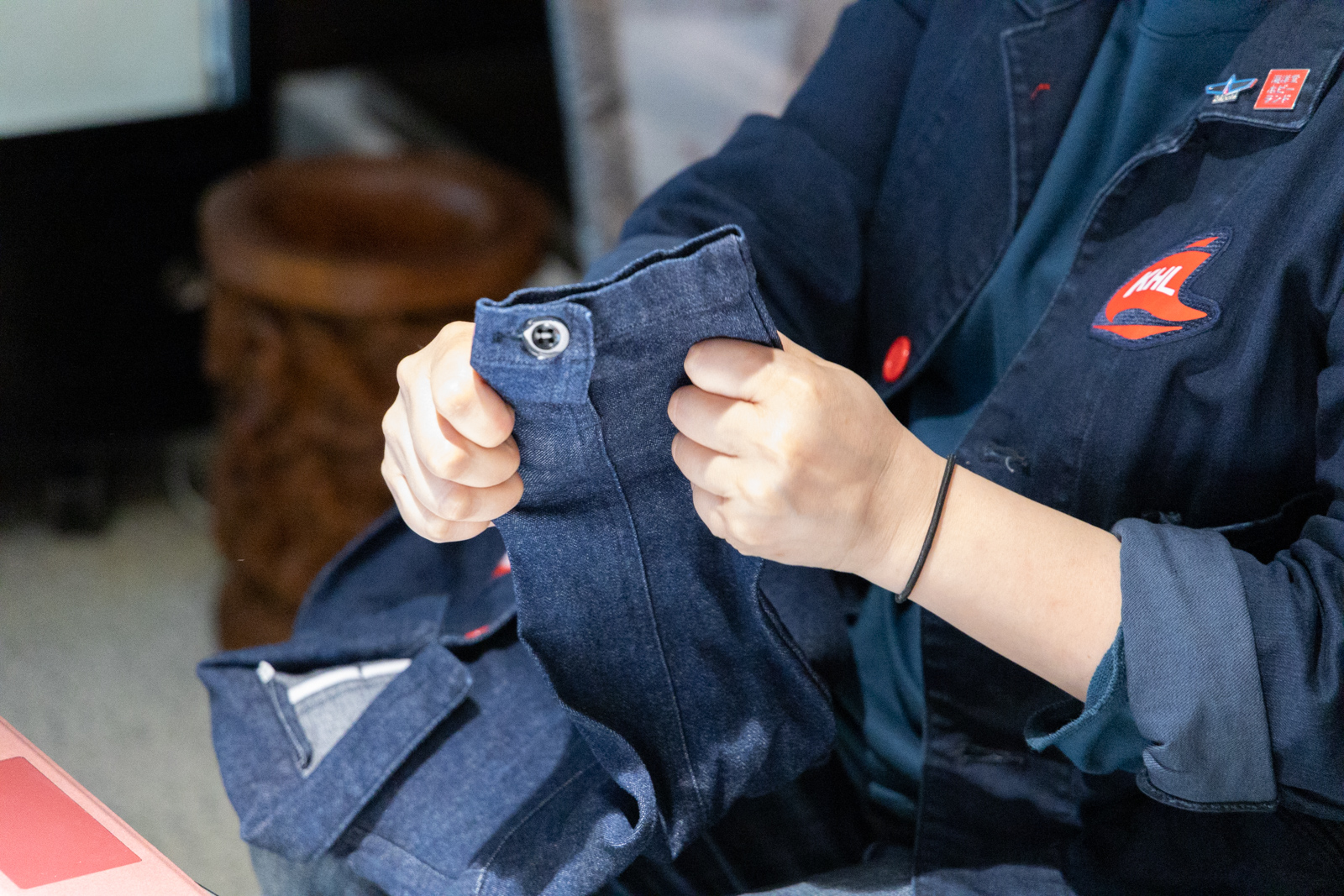 コート自体は既製品なんですが、たまゆらのデザイナーさんに、胸元と首元に海洋堂ホビーランドのロゴワッペンを施して、赤いボタンに付け替えるというカスタマイズの提案をしてもらいました。